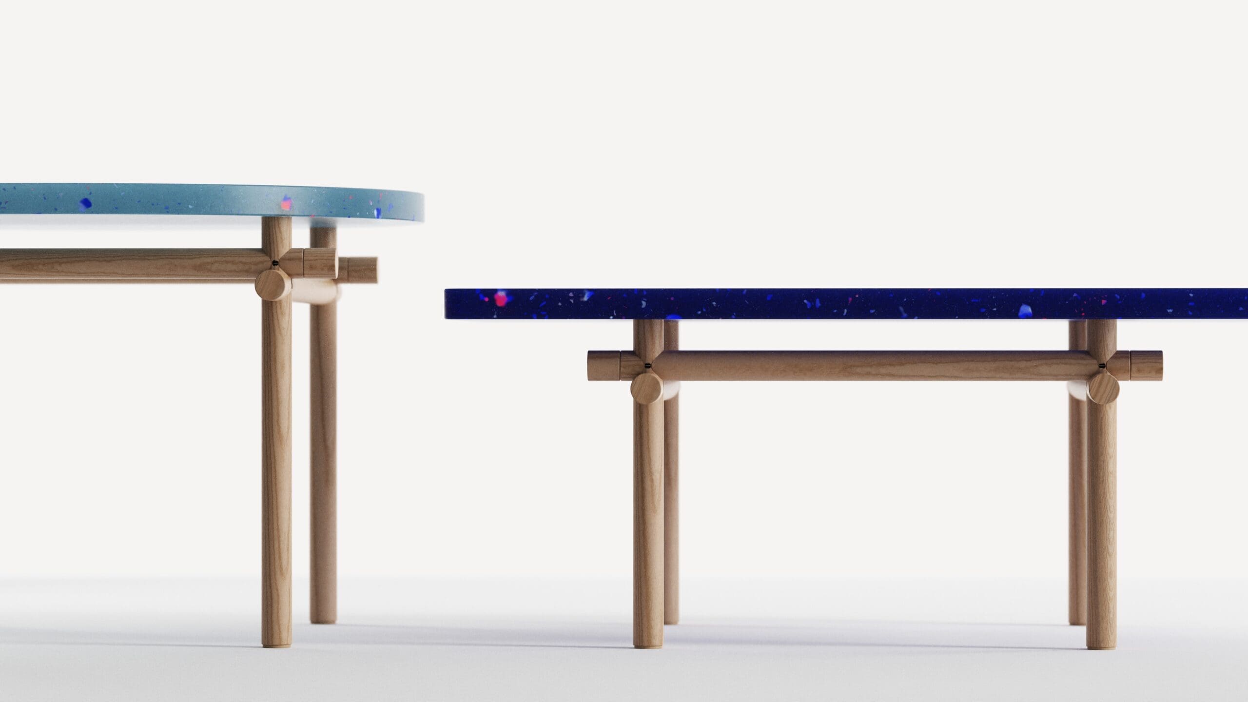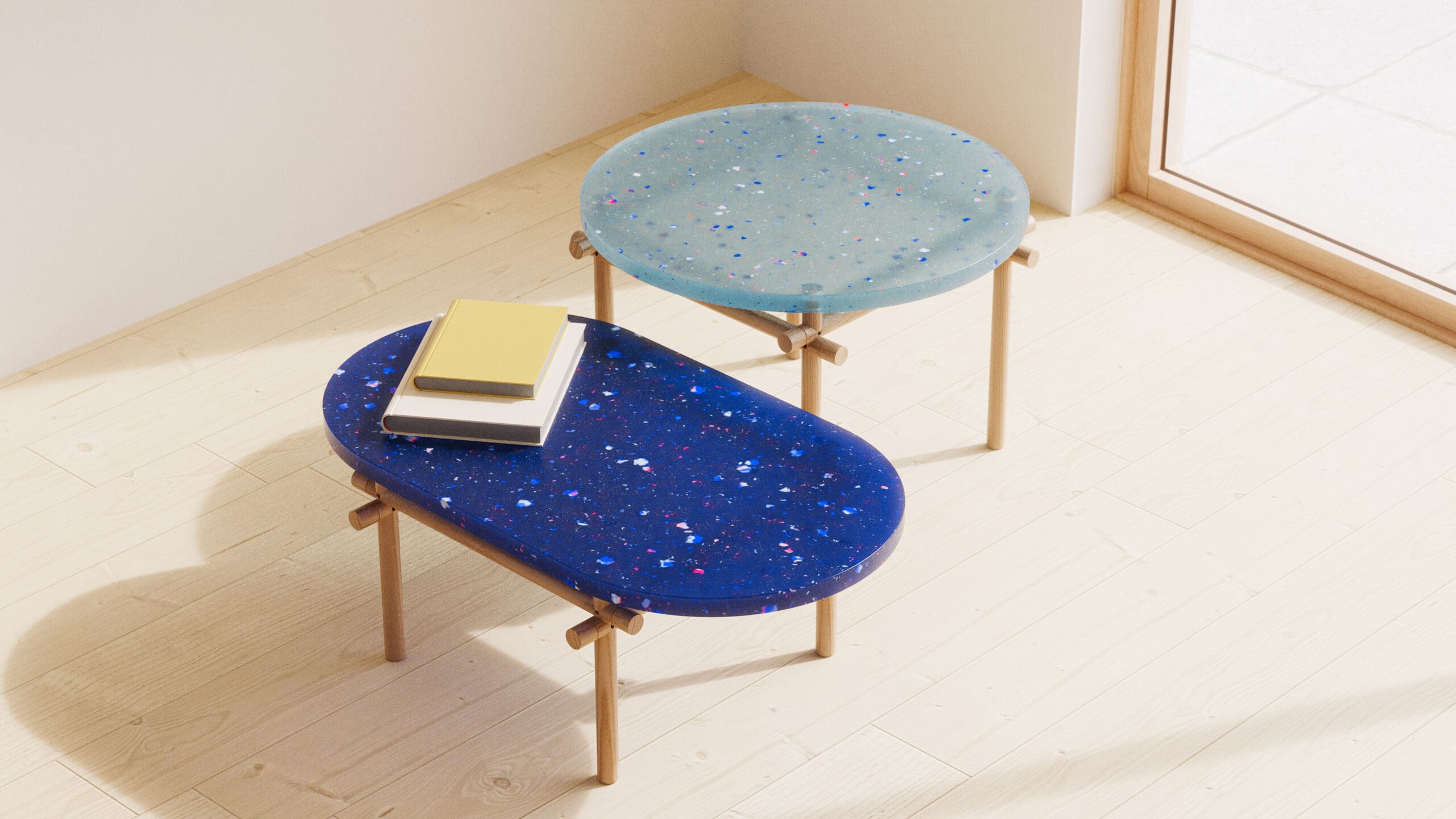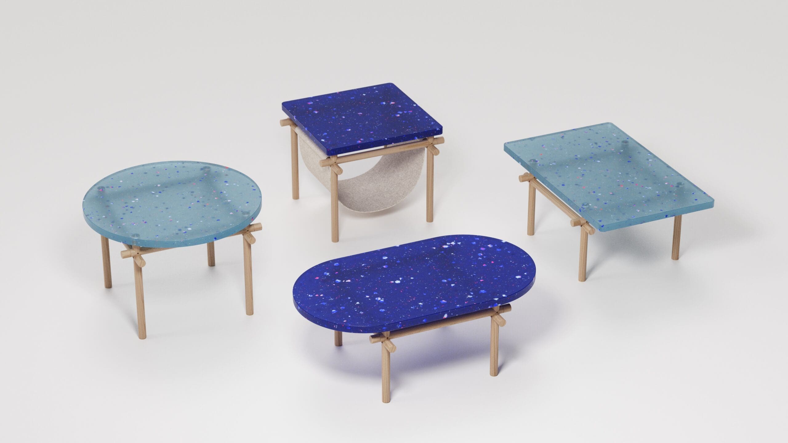 Crafted from a curated selection of recycled PET materials, the tabletop combines sophistication with playfulness, adding vibrant colors and subtle textures to any space. Its dynamic hues brighten the room while sparking a sense of joy and creativity.